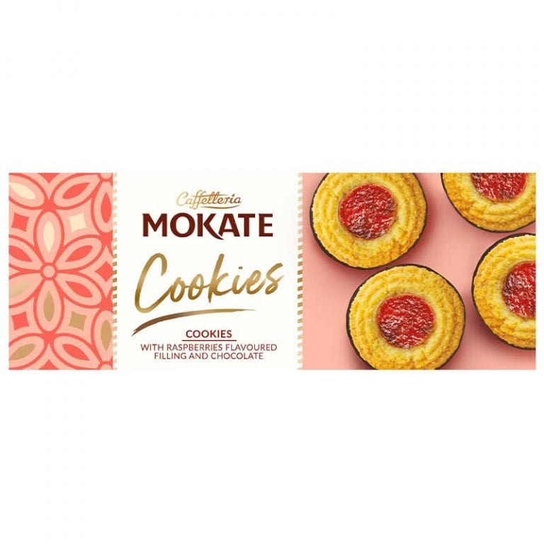Mokate Cookies with Raspberry Filling & Chocolate are delicate butter cookies featuring a fruity raspberry-flavoured centre, complemented by a smooth chocolate base. Each cookie offers a pleasing contrast of crumbly texture, tangy sweetness, and rich chocolate notes. Perfect for pairing with coffee or tea, these cookies deliver a refined and satisfying indulgence.